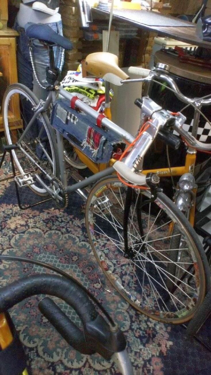 Στο ποδηλατάδικο της στοάς μπορείς να αγοράσεις και ποδηλατικά ρούχα με vintage αισθητική αλλά και σύγχρονα, όπως μακό μπλουζάκια, ζέρσεϊ, κολάν, καπελάκια, τσαντάκια. Τα τσαντάκια μάλιστα είναι χειροποίητα, από δέρμα ή δερματίνη και τα φτιάχνει μέσα στο εργαστήριό του ο ιδιοκτήτης Δημήτρης Σκαλτσάς.