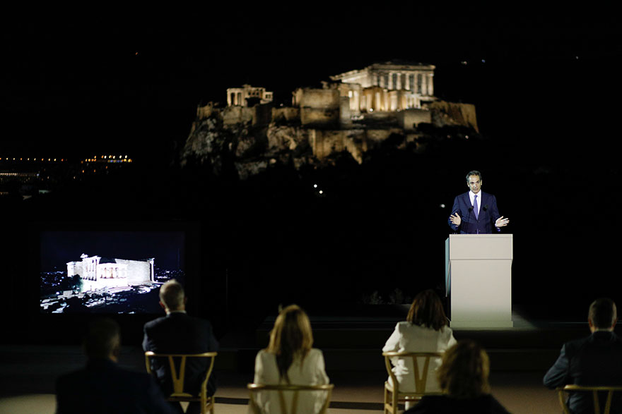 Ο νέος φωτισμός στην Ακρόπολη παρουσιάστηκε σε παγκόσμια πρώτη και μεταδόθηκε ζωντανά στις 20.00, παρουσία της Προέδρου της Δημοκρατίας, Κατερίνας Σακελλαροπούλου, του πρωθυπουργού, Κυριάκου Μητσοτάκη, της υπουργού Πολιτισμού και Αθλητισμού, Λίνας Μενδώνη, και του προέδρου του Ιδρύματος Ωνάση, Αντώνη Σ. Παπαδημητρίου.