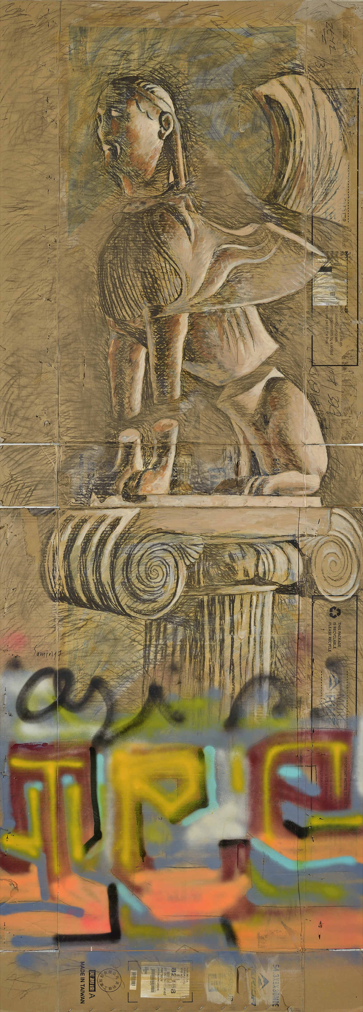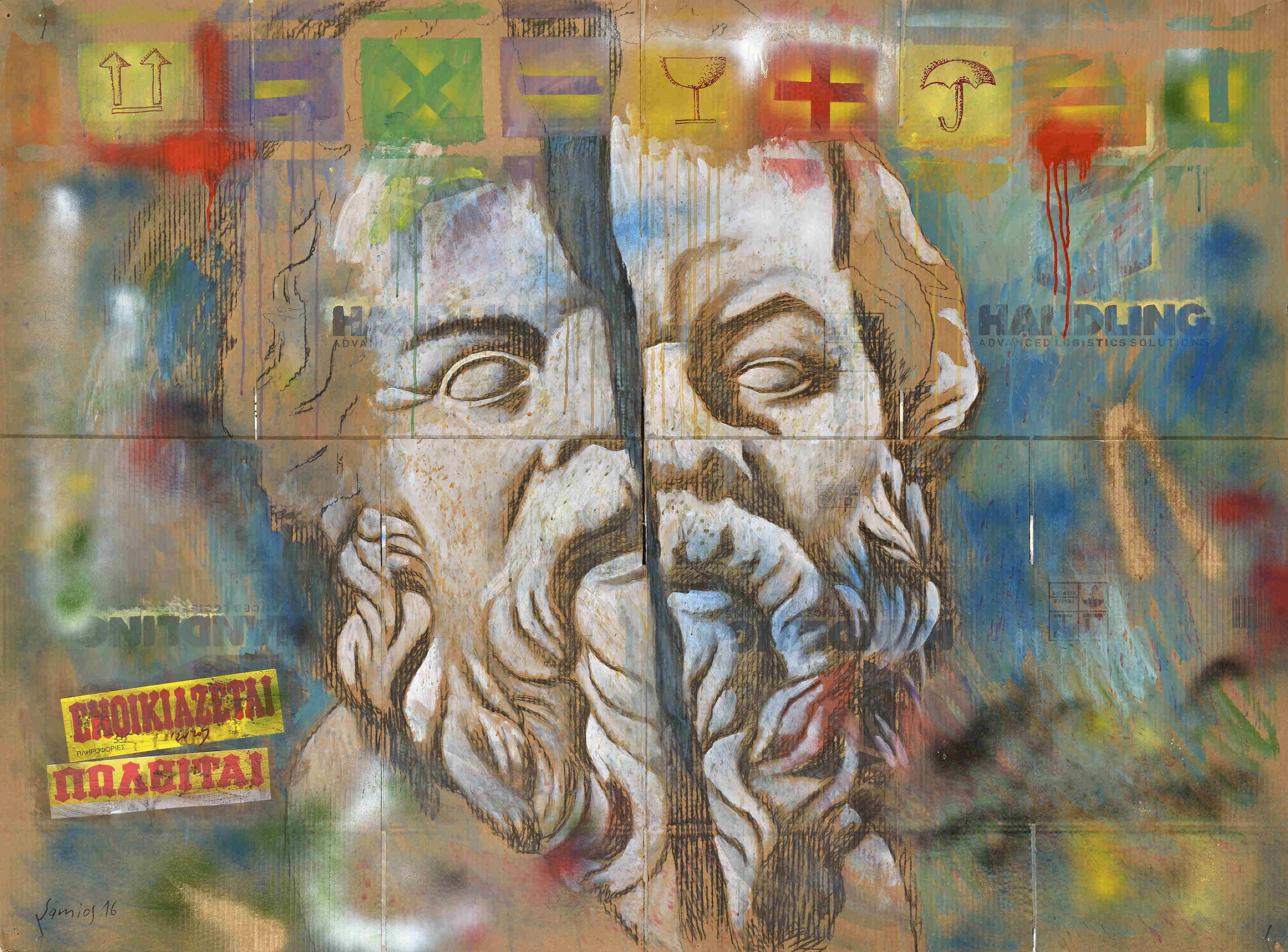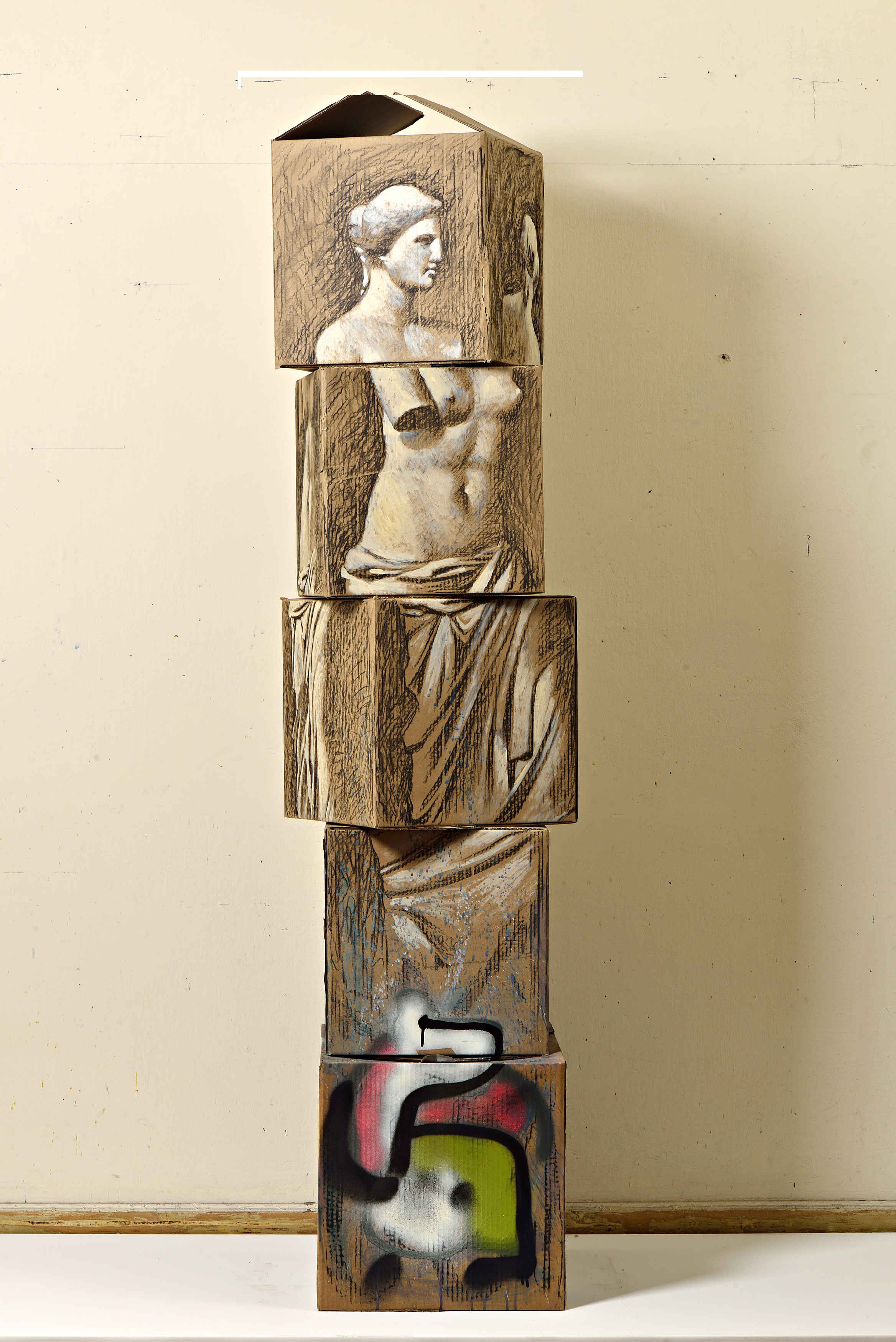 Συγκεκριμένα, ο Παύλος Σάμιος χρησιμοποίησε ως καμβά του χαρτόκουτα, που ο ίδιος περισυνέλεξε, ώστε να δημιουργήσει πάνω τους μία γέφυρα που ενώνει παρελθόν με παρόν. Αγάλματα, όπως «Η Νίκη της Σαμοθράκης», «Η Αφροδίτη της Μήλου» και τα κυκλαδικά ειδώλια, ζωγραφίζονται πάνω σε αυτό το ευτελές, άχρηστο μετά τη χρήση του και συνώνυμο της μετατόπισης υλικό, κατακερματίζονται και επισημαίνουν την αποδόμηση και την επαναπροσέγγιση του ιστορικού χρόνου. Παράλληλα, έρχονται σε επαφή με την σύγχρονη πραγματικότητα, μέσω των πολύχρωμων ανεικονικών γκράφιτι, που προστέθηκαν από τον καλλιτέχνη στο τελείωμα της δημιουργικής διαδικασίας και μας μεταφέρουν στους δρόμους της Αθήνας.