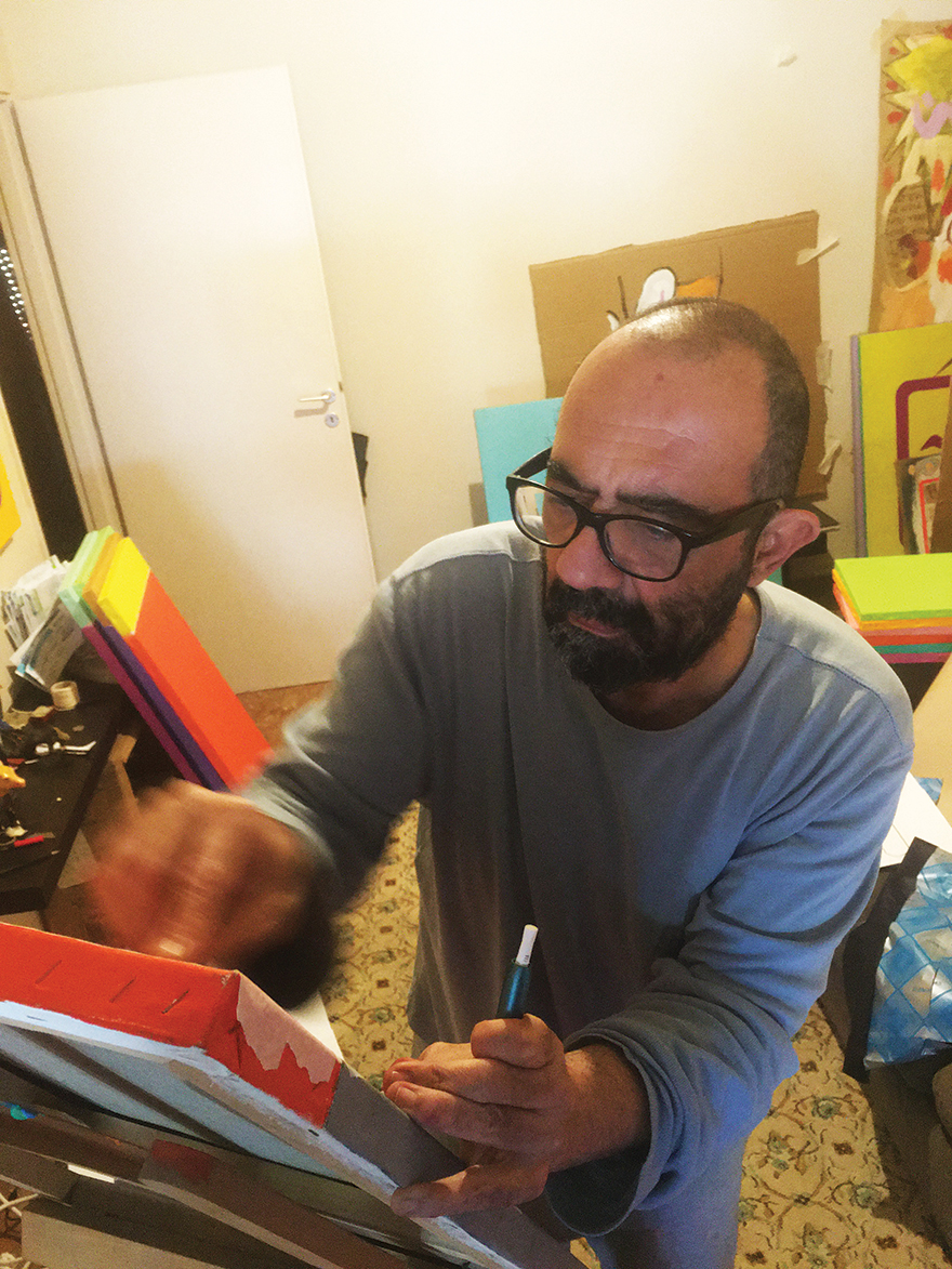 Πάγωσα. Και το καλό ήταν ότι πάγωσα έξω από το μαγαζί με τα είδη ζωγραφικής που ήταν δίπλα στο βιβλιοπωλείο. Κλείνω βιαστικά το τηλέφωνο στον υπεύθυνο κυκλοφορίας, το βάζω στην τσέπη (ναι ξέρω, θα ήταν πιο καλό για την αφήγηση αν έλεγα ένα αθώο ψεματάκι, ότι το πέταξα μακριά) και μπήκα μέσα σαν υπνωτισμένος. «Δεν έχω ιδέα από χρώματα, πινέλα και τεχνικές» είπα στην εμφανώς καλλιτεχνικής πάστας κυρία που βρισκόταν πίσω από τον πάγκο. «Και θέλω να αρχίσω να ζωγραφίζω…» Έτσι, έφυγα με το Wrangler φορτωμένο τεράστια τελάρα, άπειρα ακρυλικά χρώματα, ένα καβαλέτο και πινέλα. Είχα αποφασίσει ότι θα φτιάχνω μεγάλες επιφάνειες. Με έντονα ακρυλικά. Μέχρι και η τεχνική είχε σχηματιστεί στο μυαλό μου, που θα αναπλήρωνε την πλήρη έλλειψη ταλέντου στο σχέδιο: ένα είδος stencil με χαρτοταινία, με μασκάρισμα επιφανειών και «μπογιάτισμα». Σχεδόν είδα μπροστά μου το πρώτο έργο. Με αυτά τα εικονίδια που πάντα με εντυπωσίαζαν και τα οποία υπήρχαν παντού. Σε μεγάλη κλίμακα, όμως. Και με χρώματα που σχεδόν θα φωσφορίζουν.