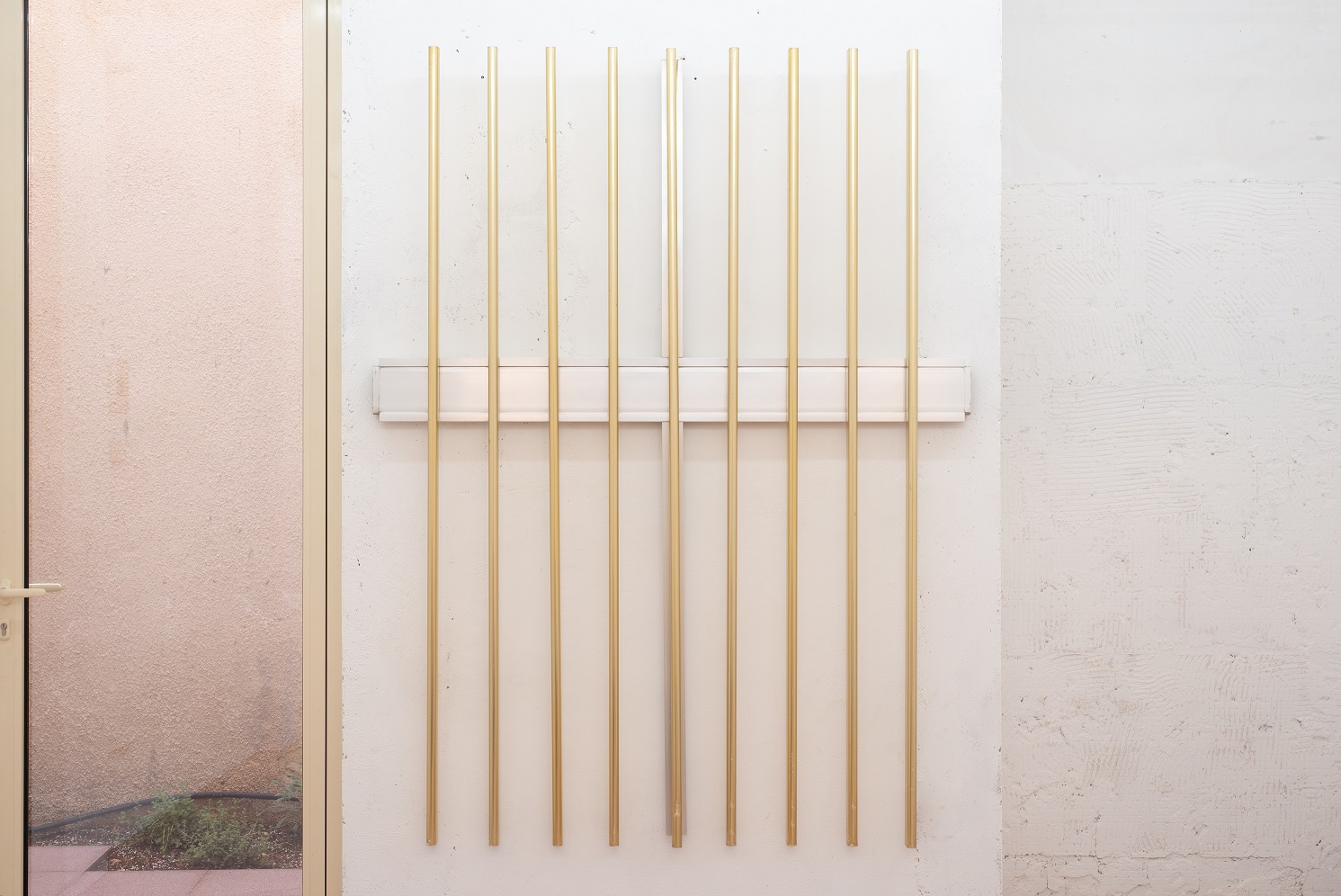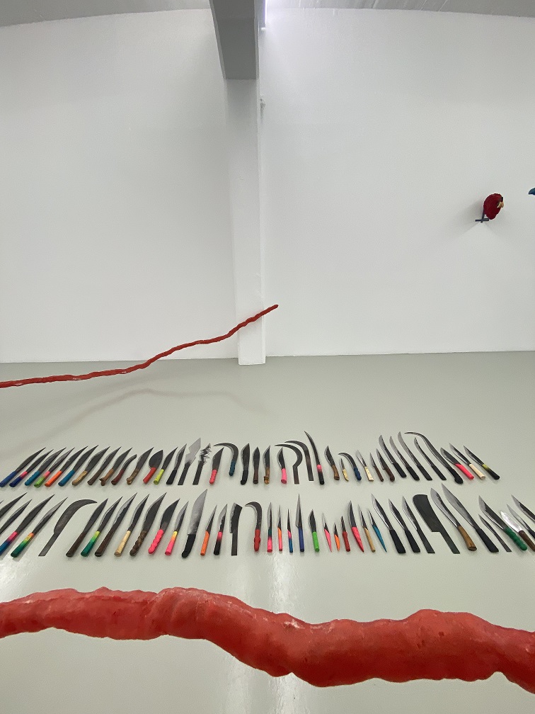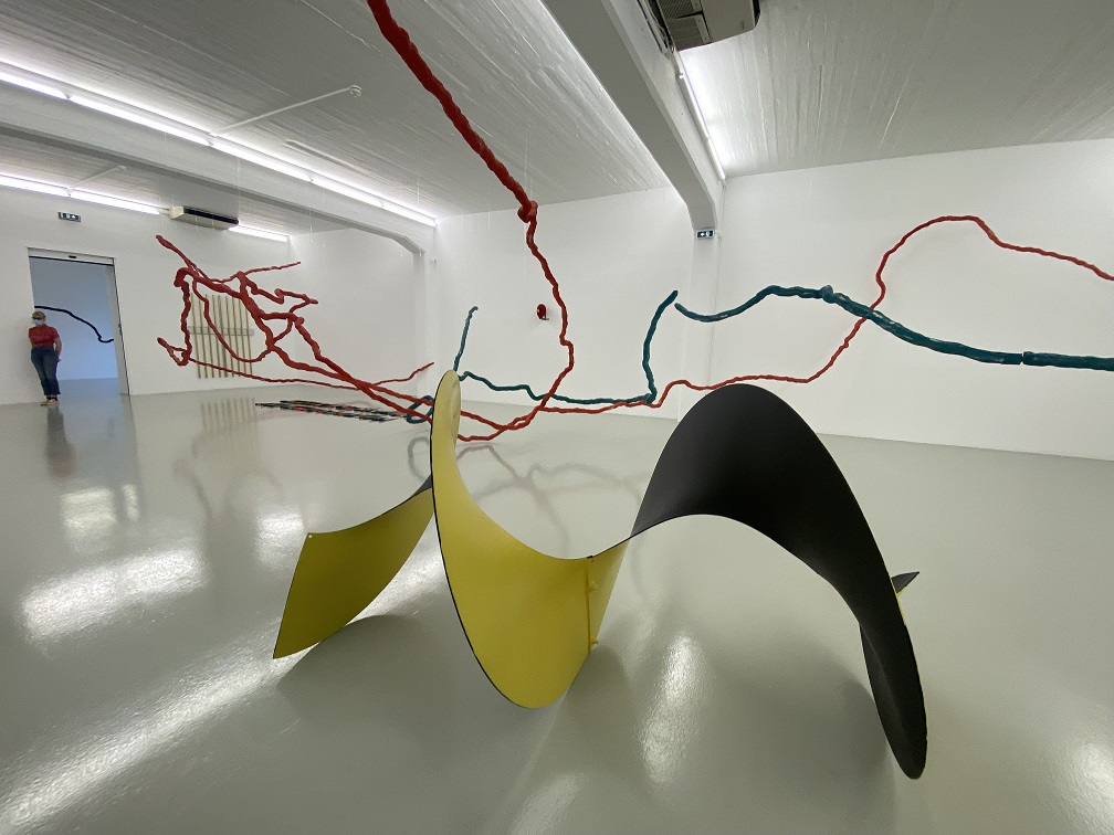 Στη μεγάλη αίθουσα, το «Working the no work» ensemble εκτυπωμένο με το δέρμα κρέμεται δίπλα σε μια φωτογραφία του Τάκη Ζενέτου από το Θέατρο Λυκαβηττού. Ασπρόμαυρη αλλά το μυαλό μου γεμίζει χρώμα από τις στιγμές που ζήσαμε σ’ αυτό το μοναδικό θέατρο. Λίγο πιο κει, το γλυπτό του Takis «Spiral» στο κίτρινο της κερκίδας του Λυκαβηττού που πια θα ΄χει ξεφτίσει σε προσκαλεί να γυρίσεις γύρω του, να πιαστείς στη δίνη του. Τέλος, τα «Μαχαίρια» του Θανάση Τότσικα με τις πολύχρωμες λαβές και τις διαφορετικές απολήξεις, μοιάζουν με πειστήρια ενός εγκλήματος που δεν συνετελέσθη ποτέ.