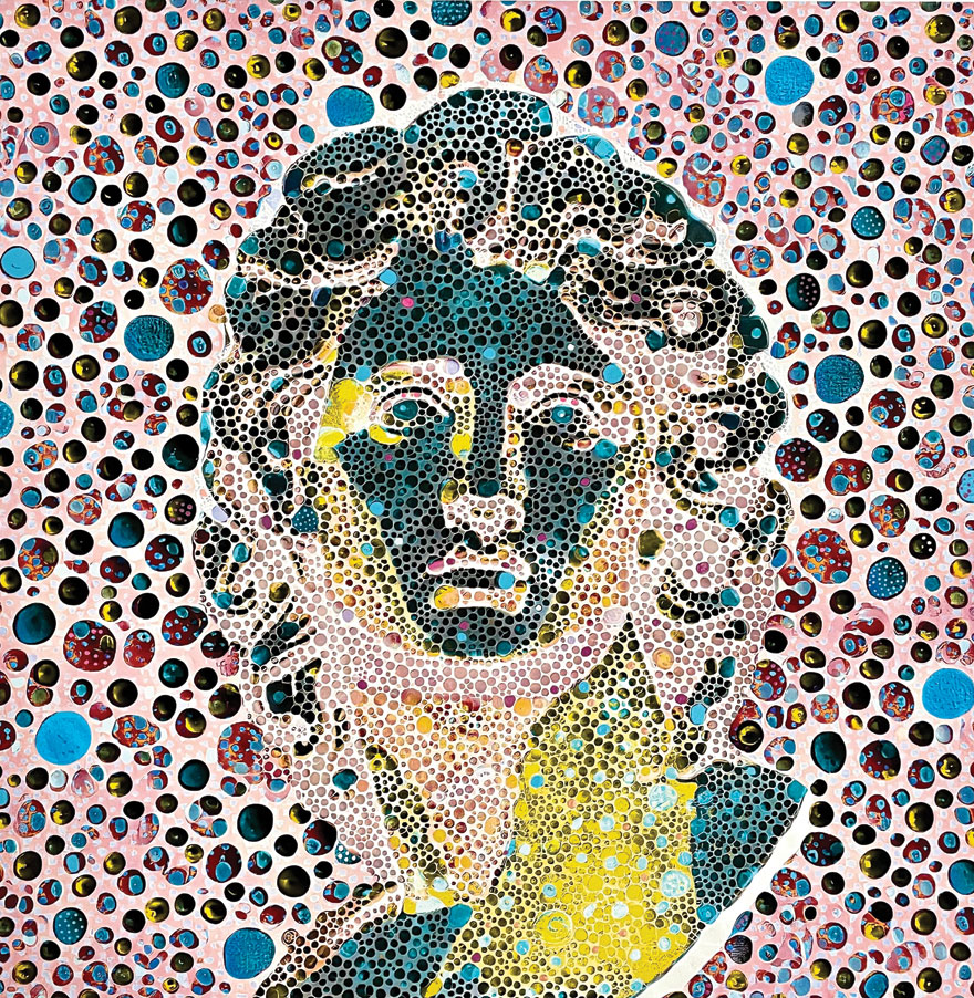 The new Tsiaras works at Blender Gallery explore the world of an obsessed Pointillist artist with a love of Portraiture – The Tsiaras DOT, tiny but with intense power -transforms the many Myths of Alexander the Great in constantly changings visions of the historic Legend. Alexander is infused with a myriad of painted, multicolored coordinates and activated dots, bordering on what Tsiaras calls “the scientific of sensualism”, or in archaic terms, a modern, Greco-Roman mosaic.”
