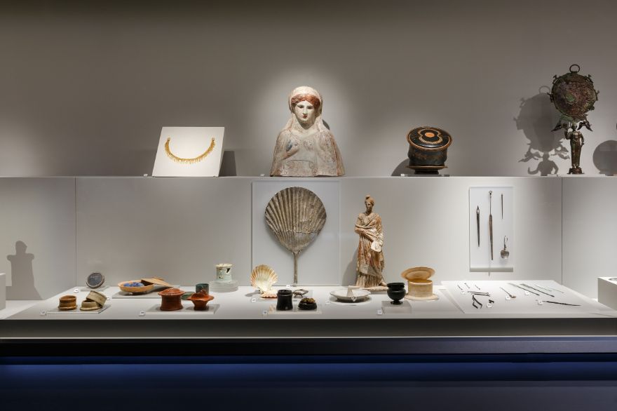 Μετά τα χρυσά περιδέραια, τις περόνες, τα σκουλαρίκια και άλλα κοσμήματα ανακαλύπτω ότι το σιδερένιο ψαλίδι για να κάνεις μπούκλες ήταν αρχαία ανακάλυψη όπως και τα τσιμπιδάκια για τα φρύδια (τριχολαβίδες τις αποκαλούν), οι ωτολαβίδες για καθαρισμό αυτιών και άλλα όργανα βασανισμού και καλλωπισμού. Άρα δεν φταίνε τα περιοδικά που μας σπρώχνουν να καλλωπιζόμαστε, το έχει η φύση μας. Η χαρά της γυναίκας απλώνεται μπροστά μου. Περίτεχνα μπουκαλάκια για πανάκριβα αρώματα, περίτεχνα αγγεία με παράξενες σκόνες, και πούδρες για λεύκανση προσώπου (το λευκό πρόσωπο ήταν τότε στη μόδα, όχι το μαυρισμένο). Αρώματα από κρόκο, τριαντάφυλλα και ίριδες, όστρακα κάτοπτρα (καθρέφτες δηλαδή) και κρέμες για το πρόσωπο...