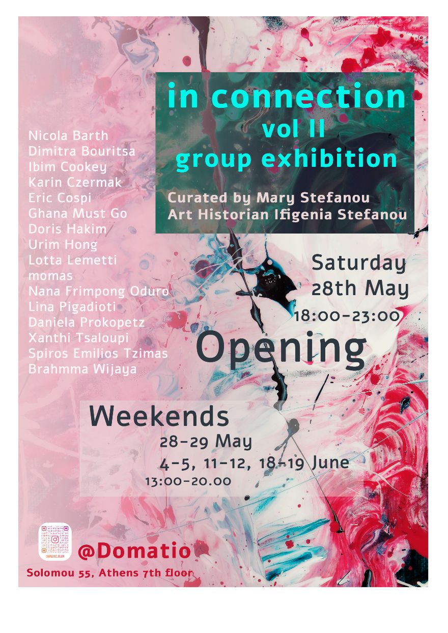 Nicola Barth, Dimitra Bouritsa, Ibim Cookey, Eric Cospi, Karin Czermak, Ghana Must Go, Doris Hakim, Urim Hong, Lotta Lemetti, momas, Nana Frimpong Oduro, Lina Pigadioti, Daniela Prokopetz, Xanthi Tsaloupi, Spiros Emilios Tzimas, Brahmma Wijaya. Δημιουργοί από τέσσερις ηπείρους, με έργα ζωγραφικής, φωτογραφίας, video art, γλυπτικής, εννοιολογικά έργα και NFTs, ύστερα από προσωπική πρόσκληση και εμπνευσμένοι από την θεματολογία του «In Connection», συναντιόνται και συνδέονται στο Domatio. Δημιουργούν έναν διάλογο μεταξύ τους και με το κοινό. Σε έναν χώρο που δεν έχει περιορισμούς, σύνορα και διαχωρισμούς.