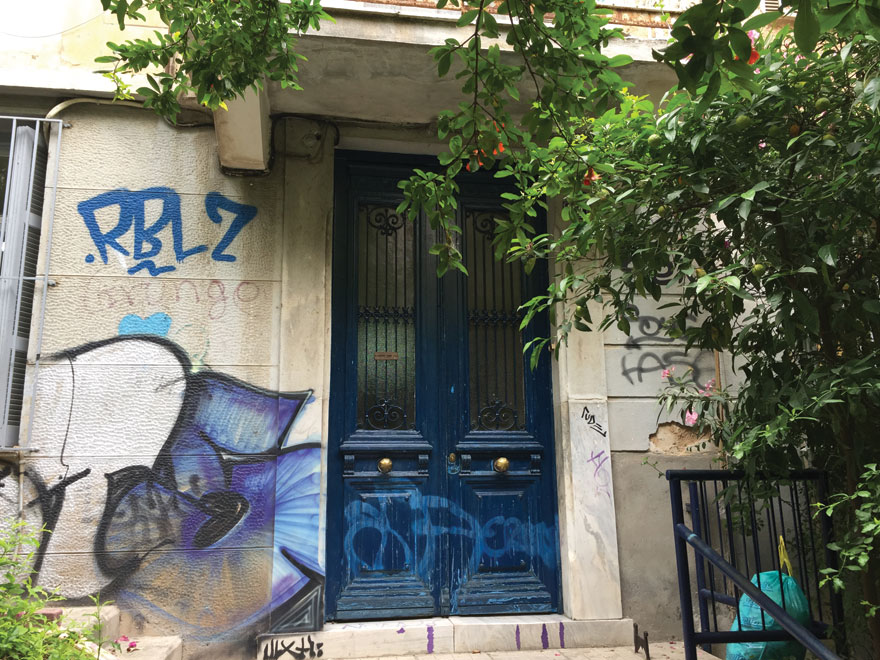 Τώρα το παρατηρώ, πριν μπω. Βρίσκεται στη γωνία Σμολένσκη και Εμ. Μπενάκη, στο (λόφο του λατομείου του) Στρέφη, μόνο που τώρα είναι λίγο πιο παλιό. Τρίπατο, αρκετά μεγάλο, όχι καθαυτό νεοκλασικό, μα με μερικά νεοκλασικά στοιχεία (σκοτίες), μικρά μπαλκόνια με σιδεριές και χτιστά φουρούσια, όρθια σκάρα για το καθάρισμα της λάσπης από τα παπούτσια, ξύλινη πόρτα με μεταλλικά χερούλια. Η κεντρική πόρτα στη Σμολένσκη 34 είναι μπλε, ένα υπέροχο μπλε, και πάνω της η μικρή μεταλλική ταμπέλα των εκδόσεων «Ερμής», όπως τη θυμόμουνα κι αυτή, μόνο λίγο πιο σκουριασμένη. Η εξωτερική όψη συμπληρώνεται με νερατζιές κι άλλες πρασινάδες, καθώς και σύγχρονα γκραφίτι πάνω στους εξωτερικούς τοίχους. Μπορώ να υποθέσω κηπάκι στο εσωτερικό του οικοπέδου.
