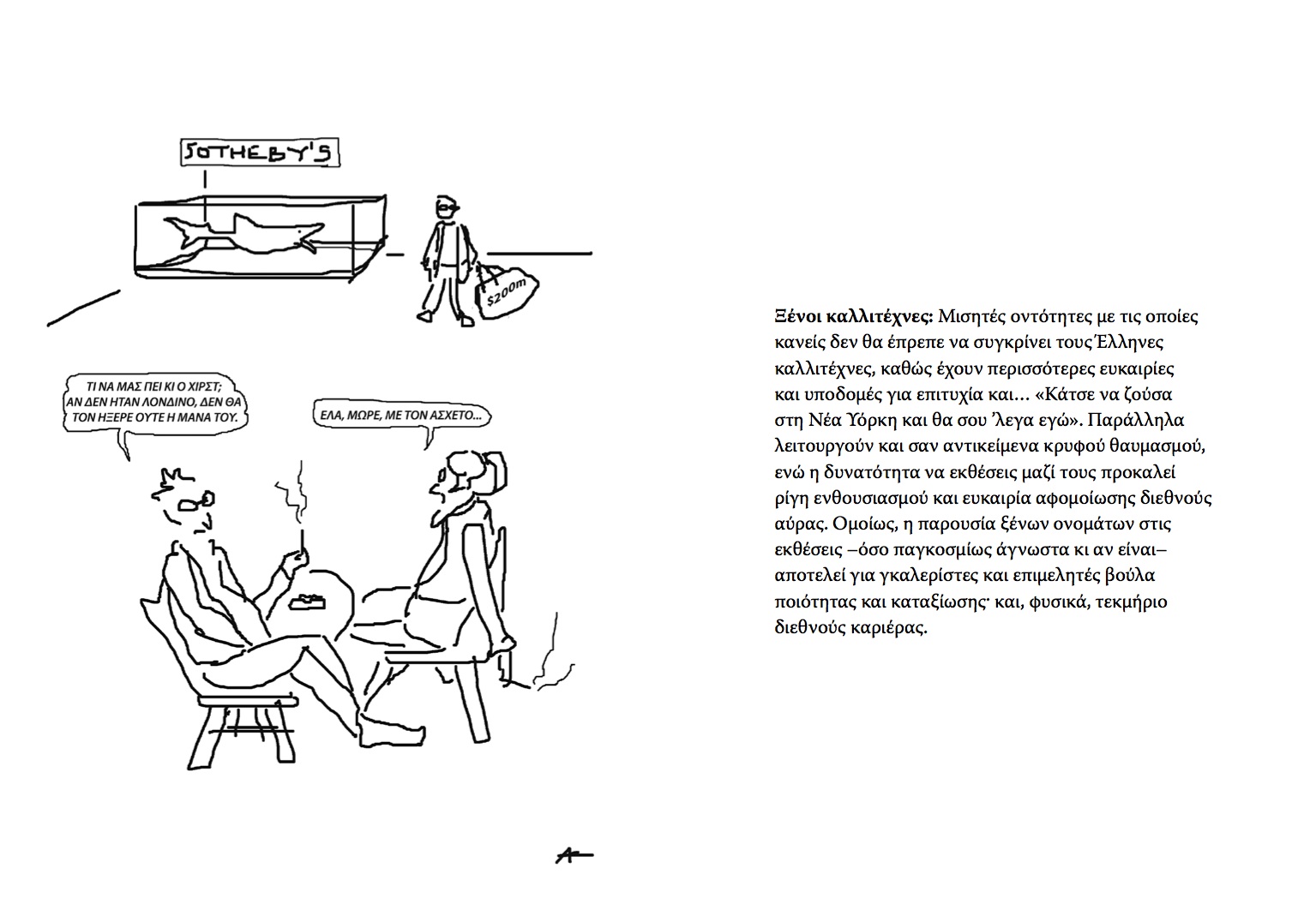 Η αλήθεια είναι ότι οι εικαστικές σκηνές όλου του κόσμου είναι κάπως έτσι, δεν πρόκειται για ελληνική ιδιαιτερότητα. Ίσως εδώ γίνεται με το γνωστό ελληνικό μπρίο, τον ιδιαίτερο ζήλο του more is more, γι’ αυτό βγάζει αυτήν την κωμική υπερβολή. Όσο για τους νέους καλλιτέχνες (τους κανονικά νέους, όχι αυτούς που έχω στο γράμμα Ν στο βιβλίο…) πιστεύω το αντίθετο: ένας καλλιτέχνης που ξεκινάει τώρα καλό είναι να διαβάσει το βιβλίο για να πάρει μια εικόνα του τι τον περιμένει και να χαλαρώσει. Αν ξέρεις τίποτα νέους καλλιτέχνες, βρήκες το ιδανικό χριστουγεννιάτικο δώρο.