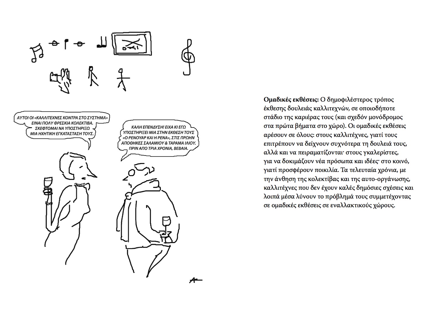 (γέλια) Έχω την αίσθηση ότι, αν απαντήσω στην ερώτησή σου, θα γίνω αυτομάτως ο πιο αντιπαθητικός άνθρωπος στον εικαστικό χώρο, και είμαι πολύ εντάξει με τους εχθρούς που έχω ήδη, δεν χρειάζομαι περισσότερους. Δεν σφάζω κανέναν, μοιράζομαι απλά κάποια κοινά μυστικά του χώρου και μαζί κάποιες προσωπικές παρατηρήσεις. Χρησιμοποιώ και ένα στοιχείο υπερβολής, τόσο στο κείμενο όσο και στις εικονογραφήσεις, για να περάσει πιο εύκολα η εικόνα – να διευκρινίσω δηλαδή ότι δεν υπάρχει «Μπιενάλε 35άρηδων χωρίς γκαλερί», δεν υπάρχει προς το παρόν τουλάχιστον! Περιγράφω τον χώρο στον οποίο κινούμαι επαγγελματικά όπως τον βλέπω: με αγάπη αλλά και με ειλικρίνεια.