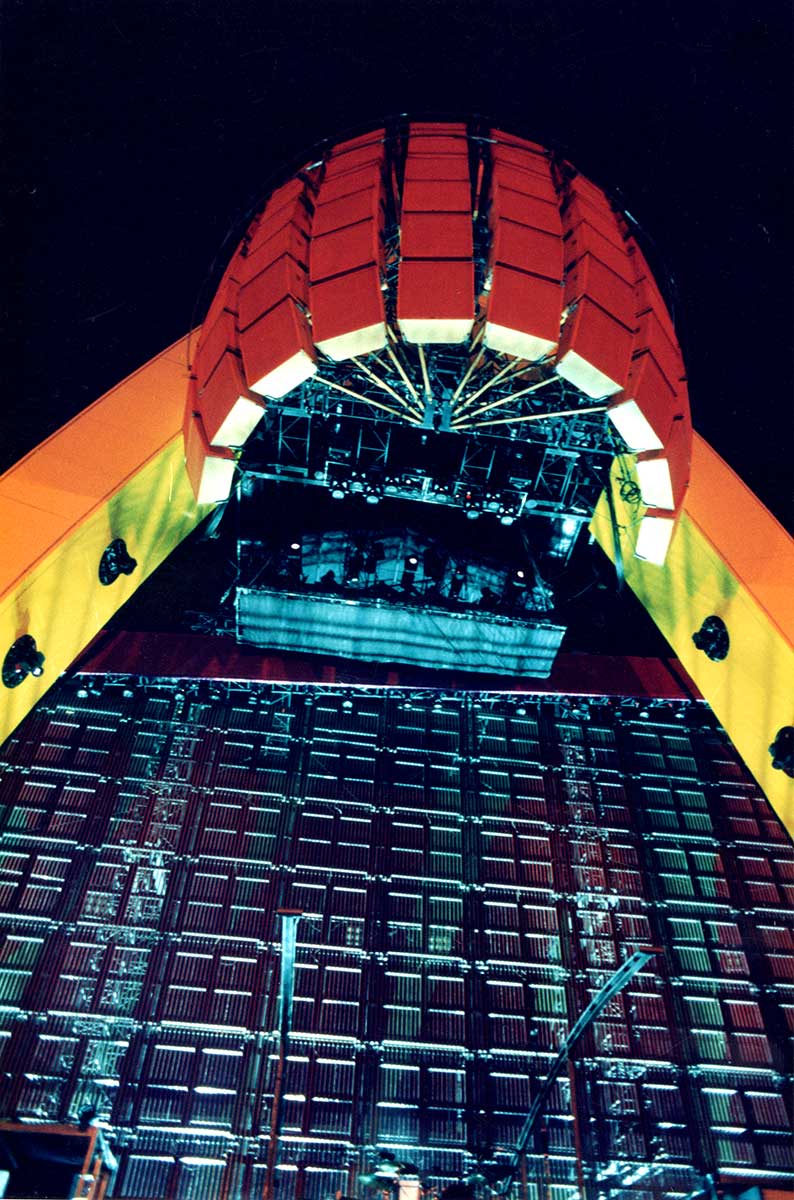 «Για την πραγματοποίηση της τρίωρης υπερπαραγωγής θα εργαστούν 237 τεχνικοί του συγκροτήματος και 200 Έλληνες. Προϋποθέτει την τελευταία λέξη της τεχνολογίας στον ήχο, το φως, τις οθόνες και τα ειδικά εφέ, ενώ για τη μεταφορά του εξοπλισμού, βάρους 1.200 τόνων, θα έρθουν από το εξωτερικό συνολικά 72 νταλίκες. Το στήσιμο του σόου, που θα γίνει σε ανοιχτό χώρο στη δεύτερη προβλήτα του ΟΛΘ, απαιτεί εργασία 36 ωρών και περιλαμβάνει ενδεικτικά τη μεγαλύτερη οθόνη βίντεο που έχει κατασκευαστεί μέχρι σήμερα, επιφάνειας 700 τετραγωνικών μέτρων και βάρους 65 τόνων, η οποία αποτελείται από 100 κομμάτια. Σκηνή φτιαγμένη από πλεξιγκλάς, που ξεπερνά τα 20 μέτρα ύψος. Πάνω της κυριαρχεί χρυσή αψίδα ύψους 100 μέτρων σε έντονο πορτοκαλί χρώμα, ένα λεμόνι-καθρέφτης ύψους 35 μέτρων και μία γυαλιστερή ελιά ύψους 12 μέτρων, περασμένη σε τεράστια οδοντογλυφίδα. Ηχητικό σύστημα σκηνής βάρους 300 τόνων, 76 ηχεία, 120 κανάλια ήχου και 6 κονσόλες. 5.000 μέτρα φωτεινού σχοινιού, 100 προβολείς, 30 προβολείς σταδίου, 24 χειροκίνητα σποτ, 6 μηχανές φωτισμού, 8 ψηφιακά κανάλια βιντεοεφέ, χρωματιστές σφαίρες, χιλιάδες λαμπτήρες και καλώδια μήκους 36 χιλιομέτρων».