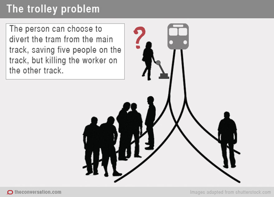 Πάμε τώρα. Φανταστείτε ότι βρίσκεστε κοντά στις γραμμές ενός τρένου. Δαιμονικός θόρυβος. Ένα τρένο πλησιάζει με ιλιγγιώδη ταχύτητα. Αντιλαμβάνεστε ότι είναι ακυβέρνητο. Στην μια πλευρά υπάρχουν πέντε εργάτες. Και στις άλλες ράγες μόνο ένας. Το τρένο κινείται τόσο γρήγορα που οι άνθρωποι δεν προλαβαίνουν να κάνουν στην άκρη. Βρίσκεστε αρκετά κοντά. Διαπιστώνετε ότι υπάρχει ένας μοχλός. Αν τον τραβήξετε, το τρένο θα αλλάξει κατεύθυνση και αντί να χάσουν τη ζωή τους πέντε άνθρωποι θα σκοτωθεί ο μεμονωμένος εργάτης. Αυτό το έθεσε η Φουτ, ενώ η Τόμσον τοποθέτησε πάνω σε μια γέφυρα έναν μεγαλόσωμο άνδρα κι εσάς. Αν σπρώχνατε αυτόν τον άνδρα θα μηδένιζε η ταχύτητα του τρένου και θα γλίτωναν οι πέντε άνδρες. Θα το κάνατε;