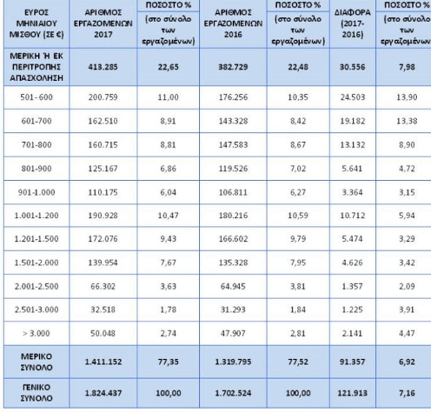 Σύμφωνα με τα στοιχεία του ειδικού αφιερώματος του συστήματος ΕΡΓΑΝΗ για την απασχόληση από το 2014 μέχρι μέχρι τις 21 Οκτωβρίου οι εργαζόμενοι με μερική ή εκ περιτροπής απασχόληση στην Ελλάδα ανέρχονται σε 413.285 (κάτι που αντιστοιχεί στο 22,65% των εργαζομένων) ενώ λαμβάνουν απολαβές μέχρι 500 ευρώ.