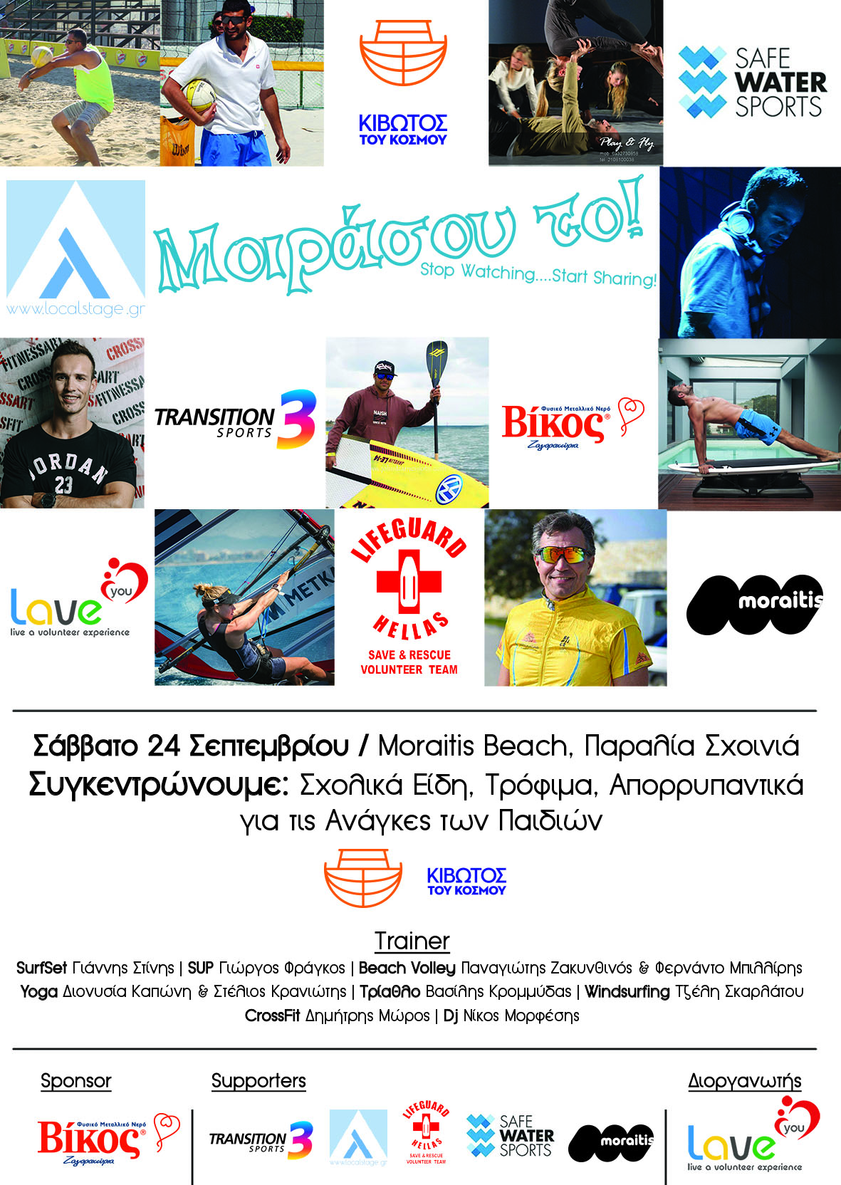 Η διαδραστική ομάδα LAVEyou πιστεύει ότι η λέξη κλειδί για το πιο όμορφο και συναρπαστικό καλοκαίρι της ζωής σου είναι «Μοιράζομαι». Μοιράσου τα hobby, τα σπορ, τις δεξιότητες, τα ενδιαφέροντα σου και ζήσε την χαρά, την καλοσύνη, την αλληλεγγύη μαζί με φίλους, γνωστούς και άγνωστους! Η δράση #Μοιράσου_ το της LAVEyou ολοκληρώνεται αυτό το Σάββατο στις καταπληκτικές εγκαταστάσεις του Αθλητικού Κέντρου Moraitis Beach με ένα αθλητικό event γεμάτο ρυθμό, διασκέδαση, αλληλεγγύη και πολύ «Μοιράζομαι!». Διακεκριμένοι αθλητές και γυμναστές από τον χώρο των θαλάσσιων σπορ καθώς και άλλων αθλημάτων θα μοιραστούν με τους συμμετέχοντες της εκδήλωσης τα μυστικά του κάθε αθλήματος για... καλό σκοπό!