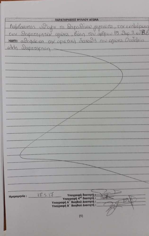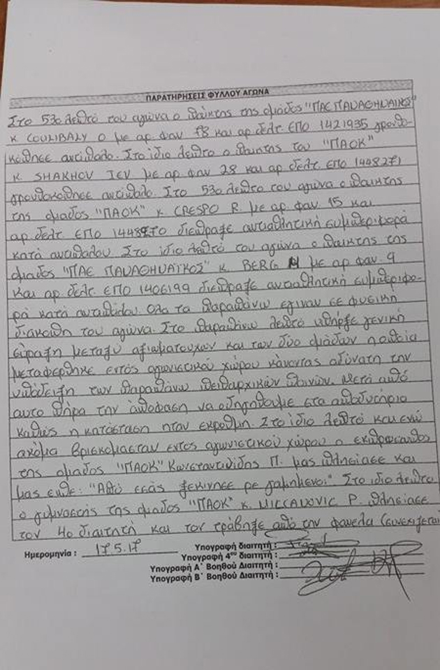 Ας δούμε τι έγραψε αναλυτικά ο διαιτητής του ντέρμπι Παναθηναϊκού - ΠΑΟΚ στο φύλλο αγώνα:
