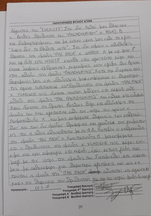 Αφού δέχθηκε τις πρώτες βοήθειες πήγε στα αποδυτήρια της ομάδας του. Εκεί, εξετάστηκε από τον γιατρό του αγώνα και μας ενημέρωσε παρουσία των εκπροσωπών και των δύο ομάδων προφορικά και γραπτώς τη γνωμάτευσή του, η οποία επισυνάπτεται με το ΦΑ. Κατόπιν, ο εκπρόσωπος της ομάδας του ΠΑΟΚ, Π. Κωνσταντινίδης, μας ενημέρωσε ότι ο Ίβιτς φέρει σκίσιμο και έχει αιμορραγία στο κεφάλι, έχει έντονη ζάλη και μαζί με τον ιατρό της ομάδας του διακομισθεί στο νοσοκομείο με ασθενοφόρο για περαιτέρω εξετάσεις και ως εκ τούτου, η ομάδα της ΠΑΕ ΠΑΟΚ αδυνατεί να αγωνιστεί χωρίς την παρουσία του προπονητή του και του ιατρού της ομάδας. Λαμβάνοντας υπόψιν τα παραπάνω γεγονότα, την ενημέρωση των παρατηρητών αγώνα, αποφάσισα την οριστική διακοπή του αγώνα. Ουδεμία άλλη παρατήρηση».