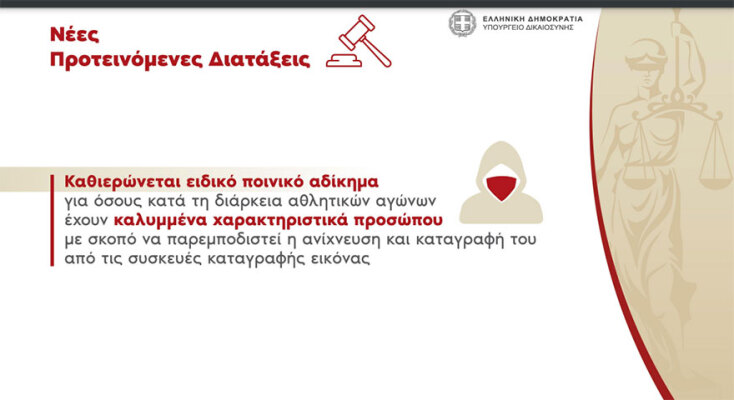 - Καθιερώνεται ειδικό ποινικό αδίκημα για όσους κατά τη διάρκεια αθλητικού αγώνα έχουν καλυμμένα τα χαρακτηριστικά του προσώπου τους, με ποινή φυλάκισης τουλάχιστον έξι μηνών.