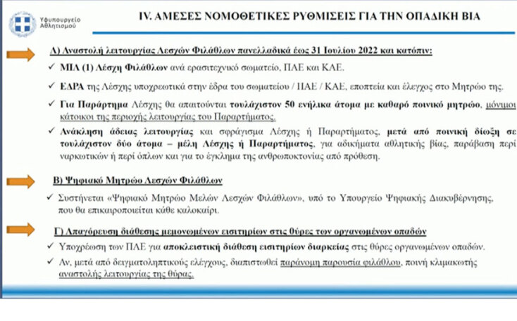 Δημιουργείται Εθνικό Κέντρο Πληροφοριών Ποδοσφαίρου, αναστέλλονται προσωρινά οι Λέσχες Φιλάθλων μέχρι τις 31 Ιουλίου 2022 και ανακαλείται η άδεια σε μία Λέσχη, αν υπάρχει ποινική δίωξη σε τουλάχιστον δύο μέλη της, είναι ορισμένα μόνο από τα μέτρα που ανακοινώθηκαν για τη βία στα γήπεδα.