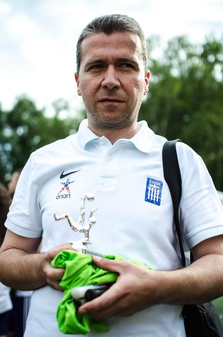 Τον συνάντησα στην Καλαμαριά πέριξ του Εθνικού Σταδίου Μίκρας, στο ειδικά διαμορφωμένο γήπεδο που προπονείται ο «Πυρσός», στην προπόνηση. Λειψοί σε αριθμούς λόγω τραυματισμών στο τουρνουά που προηγήθηκε στην Αθήνα, τα κουδουνίσματα από την ειδική μπάλα και οι κατευθυντήριες οδηγίες της γυμνάστριας Χρύσας, έξω απ’ τις γραμμές, αντηχούσαν ως το σημείο που πάρκαρα. Τελειώνοντας την προπόνησή του, καθίσαμε μαζί στον πάγκο και τα είπαμε. Τον ρώτησα πώς γίνεται να παίζει μπάλα κάποιος στα 44, πόσο μάλλον, τυφλός. Μου απάντησε πως έπαιζε πριν τυφλωθεί, στο χωριό με τα παιδιά της ηλικίας του.