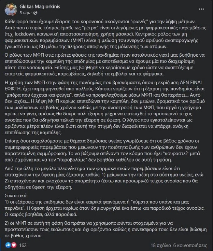 Τους λόγους για τους οποίους η χρήση μάσκας για τον κορωνοϊό δεν χρειάζεται να γίνει και πάλι υποχρεωτική αναλύει με ανάρτησή του ο Γκίκας Μαγιορκίνης.