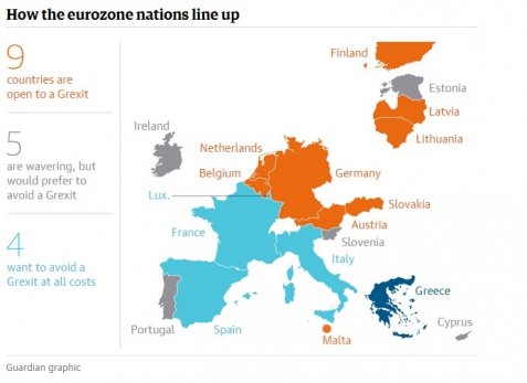Με έναν επεξηγηματικό χάρτη-γράφημα που παρουσιάζει τη διάταξη χωρών-δυνάμεων στην Ευρωζώνη όσον αφορά στο ελληνικό ζήτημα, ενημερώνει το αναγνωστικό κοινό του ο Guardian.