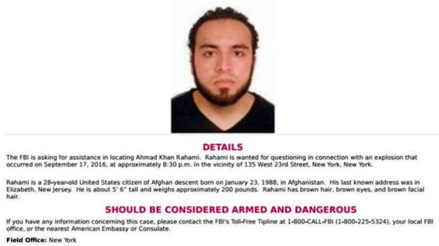 Ο δήμαρχος της Νέας Υόρκης, Μπιλ ντε Μπλάσιο κατονόμασε τον φερόμενο ως ύποπτο για την έκρηξη βόμβας στην περιοχή του Τσέλσι το Σάββατο, η οποία είχε ως αποτέλεσμα τον τραυματισμό 29 ανθρώπων. Ο ύποπτος φέρεται να είναι ο 28χρονος Αχμάντ Χαν Ραχαμί, γεννημένος στο Αφγανιστάν με αμερικανική υπηκοότητα. Η αστυνομία της Νέας Υόρκης έδωσε στη δημοσιότητα φωτογραφία του υπόπτου και προειδοποιεί ότι πρόκειται για άνδρα «ένοπλο και επικίνδυνο».
