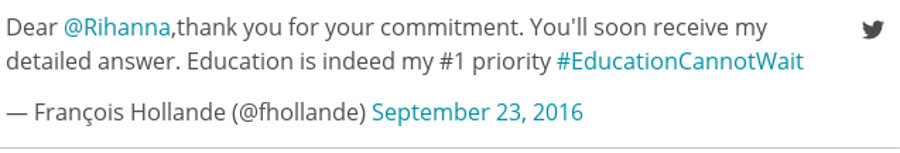O πρόεδρος της Γαλλίας απάντησε με μήνυμα στο Twitter στην σταρ της ποπ Ριάνα, η οποία είχε απευθυνθεί στον Φρανσουά Ολάντ για να μάθει για την πορεία ενός προγράμματος της Unicef που είναι αφιερωμένο στην εκπαίδευση.