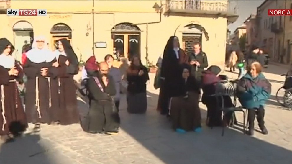 From SkyTG24: firemen assisting nuns in Norcia as quakes continue to bring that city to its knees: #eartquake #Norcia #Terremoto pic.twitter.com/JdDcAff3jh