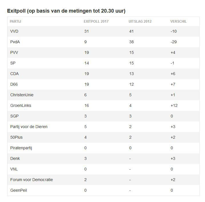 O πρώτες εκτιμήσεις κάνουν λόγο για επικράτηση του VD του πρωθυπουργού Μαρκ Ρούτε, λαμβάνοντας 31 από τις 150 έδρες της ολλανδικής Βουλής, έναντι 19 του αντι-σλαμιστή Γκερντ Βίλντερς.
