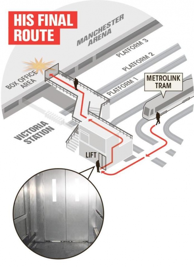 Ο Abedi βγήκε στον σταθμό Victoria πήρε ασανσέρ και ανέβηκε ένα επίπεδο στον χώρο του σταδίου. Φαίνεται χαλαρός να ακουμπά στον τοίχο του ασανσέρ.