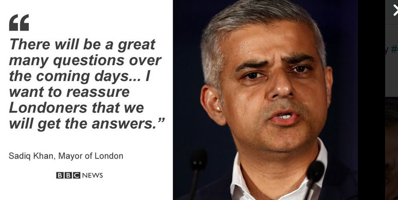 Ότι υπάρχουν πολλά αναπάντητα ερωτηματικά, «αυτά είναι πολύ σημαντικά ερωτήματα που πρέεπι τις επόμενες ημέρες να απαντηθούν» για το ολοκαύτωμα στον πύργο του Λονδίνου υπογράμμισε ο δήμαρχος του Λονδίνου Σαντίκ Χαν, σημειώνοντας πλέον ότι τίθεται ζήτημα με την ασφάλεια των πολυώροφων κτιρίων κατοικιών.