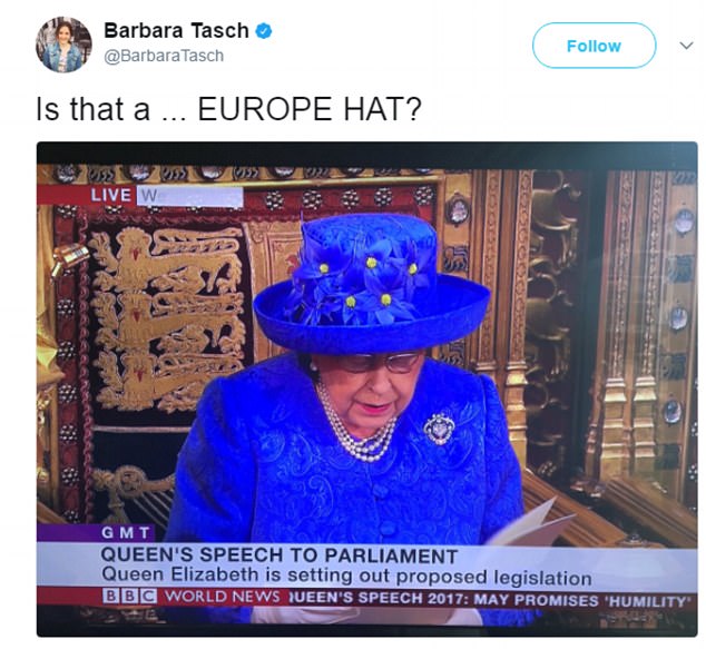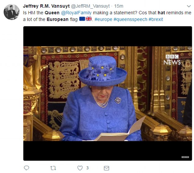 «Η βασίλισσα παραθέτει λόγο για τα σχέδια περί Brexit φορώντας ένα καπέλο που παραδόξως μοιάζει με την ευρωπαϊκή σημαία» σχολίασε στο Twitter από την πλευρά της η ευρωσκεπτικιστική εφημερίδα Daily Mail.