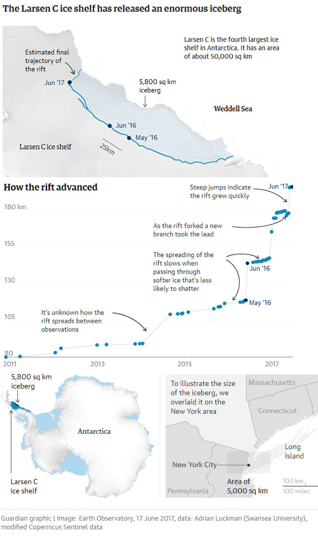 «Το παγόβουνο σχηματίσθηκε τα τελευταία 24ωρα» διευκρινίζουν οι επιστήμονες, οι οποίοι παρακολουθούσαν την αποκόλληση αυτού του γιγάντιου όγκου από πάγο, που υπολογίζεται πως έχει έκταση σχεδόν 6.000 τετραγωνικά χιλιόμετρα. Η αποκόλληση έγινε από την παγοκρηπίδα Larsen, όπου οι επιστήμονες παρακολουθούσαν εδώ και πάνω από μια δεκαετία την εξέλιξη μιας μεγάλης ρωγμής. Η ανάπτυξη της ρωγμής επιταχύνθηκε μετά το 2014. Όπως μετέδωσε το βρετανικό BBC, το παγόβουνο, το πάχος του οποίου είναι πάνω από 200 μέτρα, δεν αναμένεται βραχυπρόθεσμα να μετακινηθεί μακριά ή πολύ γρήγορα.