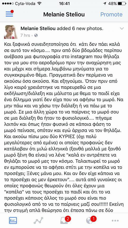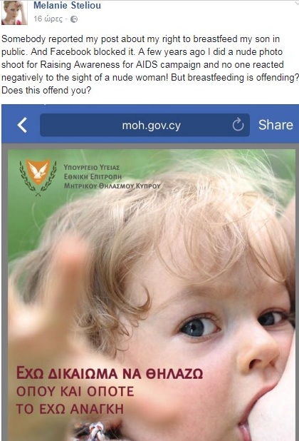 Το Facebook κατέβασε φωτογραφία της ηθοποιού και τηλεοπτικής παρουσιάστριας Μέλανης Στέλιου, στην Κύπρο, να θηλάζει τον πεντάμηνο γιο της, ύστερα από καταγγελία χρήστη.