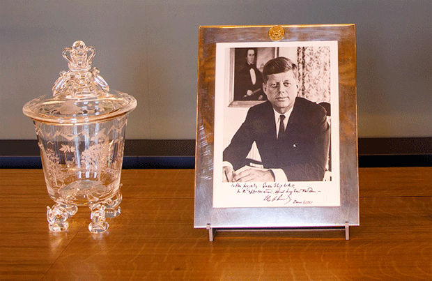 Η φωτογραφία μέσα σε ασημένια κορνίζα του κοσμηματοπωλείου Tiffany εκτίθεται στο τμήμα «Δώρα από τη Βόρεια και τη Νότια Αμερική» και φέρει ιδιόχειρη αφιέρωση του Κένεντι, στην οποία ο Αμερικανός πρόεδρος εκφράζει την «πολύ μεγάλη εκτίμησή του» προς τη μονάρχη.