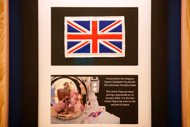 Δίπλα στην ταπισερί, ένα εντυπωσιακό πορτραίτο της Ελισάβετ Β΄προσελκύει την προσοχή: Δόθηκε από τον πρόεδρο της Ρουάντας Πολ Καγκάμε το 2003. Το έργο τέχνης είναι φτιαγμένο από μπανανόφλουδες, χρωματισμένες και πλεγμένες μεταξύ τους. Στα πιο... σύγχρονα δώρα, η σημαία της Βρετανίας που είχε στη στολή του Βρετανός αστροναύτης ο οποίος πραγματοποίησε διαστημικό περίπατο το 2016.