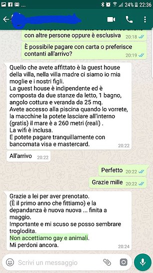 «Είναι η πρώτη χρονιά που νοικιάζουμε τους χώρους μας, λυπάμαι αν μπορεί να μοιάσω άξεστος, αλλά δεν δεχόμαστε ζώα και γκέι», έγραψε χαρακτηριστικά.