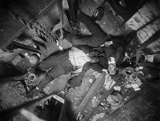 Τα πτώματα δύο κλεφτών, του Ρόμπερτ Γκριν (χειριστής ασανσέρ, αριστερά) και του Τζέικομπ Τζάζεντορφ (πολιτικός μηχανικός, δεξιά) στον πάτο ενός ανελκυστήρα μετά από αποτυχημένη απόπειρα ληστείας (24 Νοεμβρίου 1915).