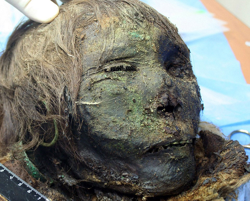 Η πράσινη απόχρωση στο πρόσωπό της προέρχεται από τα υπολείμματα ενός χάλκινου μαγειρικού σκεύους, που προφανώς προοριζόταν να την προστατεύσει στο ταξίδι της στη μετά θάνατον ζωή.