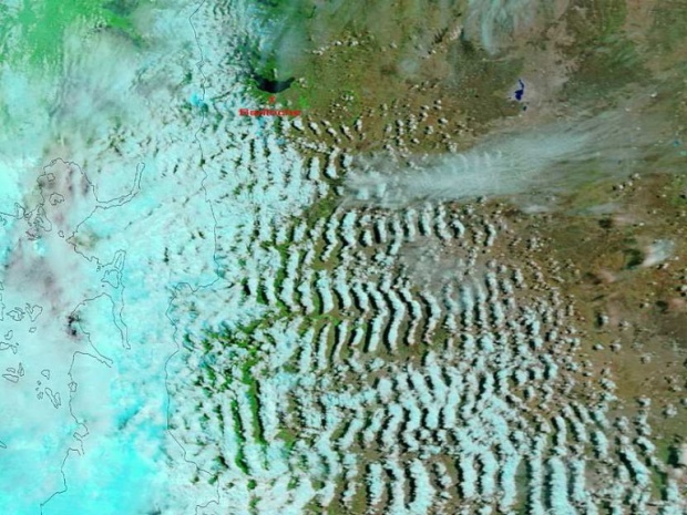 Τα πράγματα όμως δεν είναι ακριβώς έτσι. Η διακεκομμένη γραμμή «ψεκάσματος», μοιάζει με αυτό που λέμε «κυματοειδή σύννεφα» (Lee waves), που προκαλούνται από περιοδικές μεταβολές της ατμοσφαιρικής πίεσης, της θερμοκρασίας και του ορθομετρικού ύψους που προκαλείται από κατακόρυφη μετατόπιση σε ένα ρεύμα αέρα, όταν ο άνεμος φυσάει πάνω από ένα ένα βουνό ή μια οροσειρά. Μπορούν επίσης να προκληθούν από τον άνεμο της επιφάνειας που φυσάει (και εκτρέπεται) πάνω από μια εδαφική έξαρση ή και σε μεγάλα υψόμετρα, όταν ο άνεμος διαθλάται από ανοδικά θερμά ρεύματα.