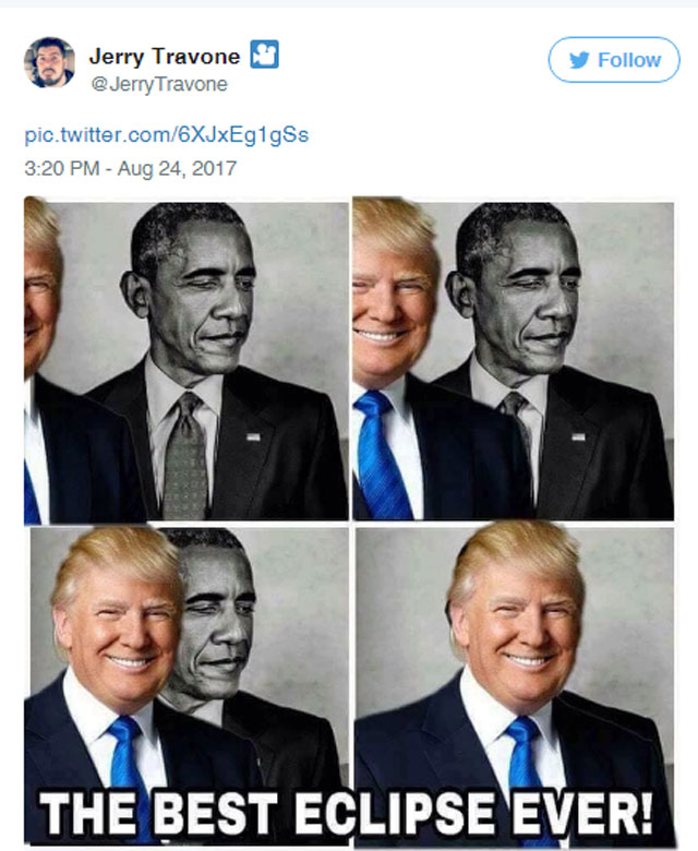 Το tweet αναρτήθηκε από χρήστη ως απάντηση στο tweet του Τραμπ προς τους Mitch McConnell και Paul Ryan, δείχνοντας έναν χαμογελαστό Τραμπ να κινείται καλύπτοντας την ασπρόμαυρη φωτογραφία του Ομπάμα, ενώ η λεζάντα στο κάτω μέρος γράφει «Η καλύτερη έκλειψη όλων των εποχών»