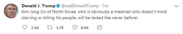 «Ο Κιμ Γιονγκ Ουν της Βόρειας Κορέας, ο οποίος είναι προφανώς ένας τρελός που δεν τον νοιάζει να κάνει τον λαό του να λιμοκτονεί ή να τον σκοτώνει, θα δοκιμαστεί όπως ποτέ μέχρι τώρα», έγραψε ο Τραμπ στο Twitter μια ημέρα αφού ανακοίνωσε πρόσθετες κυρώσεις σε βάρος της Πιονγκγιάνγκ.
