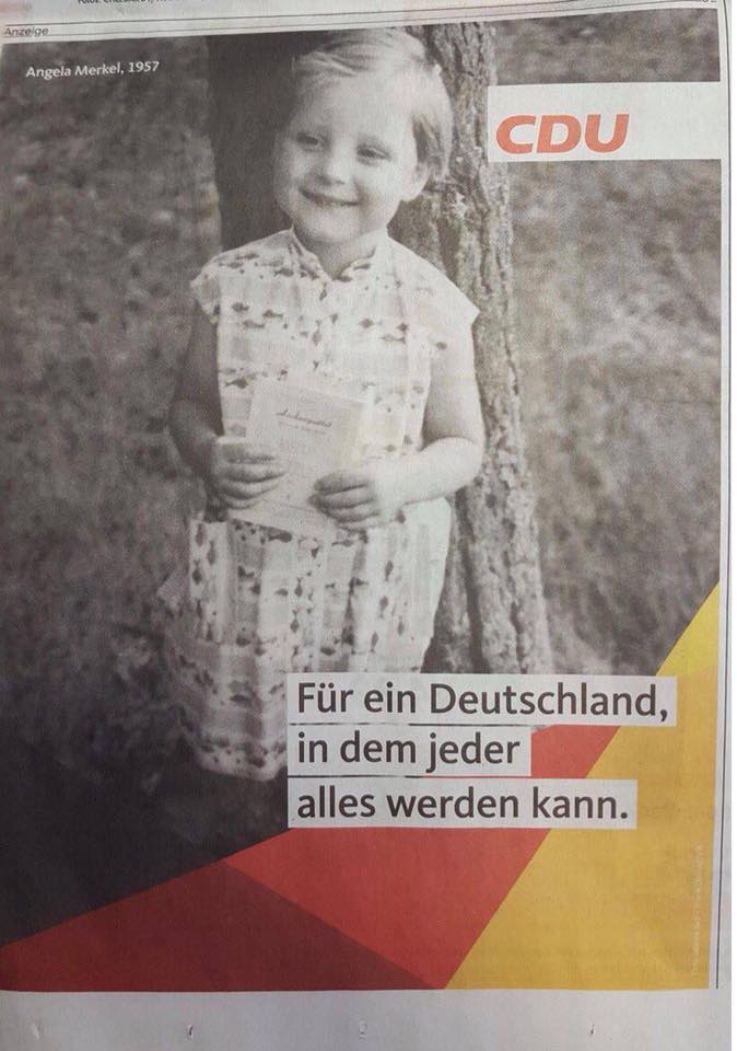 Σε αυτήν είναι η Μέρκελ σε μικρή ηλικία και η χρονιά είναι το 1957. Η καγκελάριος στέκεται με ένα μειδίαμα, μπροστά σε ένα δέντρο και στο κάτω μέρος υπάρχει μόνο η φράση ««Για μια Γερμανία όπου ο καθένας μπορεί να γίνει ό,τι θέλει».