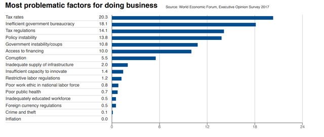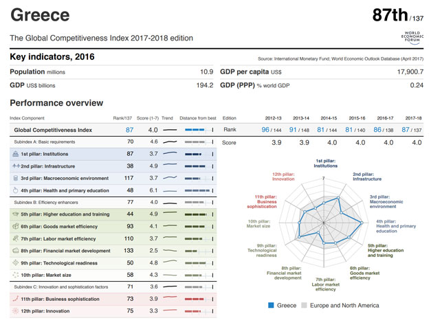 Η αδύναμη επίδοση της ελληνικής οικονομίας και για το 2017-2018 αποτυπώνει την φθίνουσα πορεία της Ελλάδας στον παγκόσμιο χάρτη ανταγωνιστικότητας. Οι παράγοντες που επιβαρύνουν τις επιδόσεις της Ελλάδας σύμφωνα με την έκθεση είναι οι υψηλοί φορολογικοί συντελεστές, η αναποτελεσματική δημόσια διοίκηση, το φορολογικό καθεστώς αλλά και η αστάθεια του πολιτικού συστήματος.