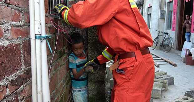 Ο μικρός Χούανγκ έπαιζε κρυφτό και στην προσπάθειά του να μη γίνει αντιληπτός, κόλλησε ανάμεσα σε δύο τοίχους. Χρειάστηκε η συνδρομή πυροσβεστών για τον απεγκλωβισμό του.