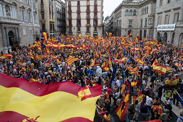 Κρατούσαν σημαίες ισπανικές, καταλανικές και ευρωπαϊκές και πανό που έγραφαν «Η Καταλονία είναι η Ισπανία».