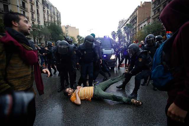 Βίαια επεισόδια συνεχίζουν να εκτυλίσσονται έξω από εκλογικά κέντρα στην Καταλονία, από τη στιγμή που άνοιξαν οι κάλπες για το δημοψήφισμα της ανεξαρτησίας.