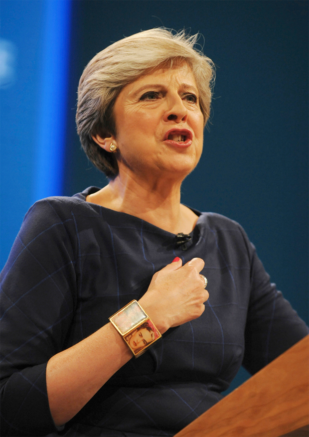 Η πρωθυπουργός της Μεγάλης Βρετανίας μίλησε για το όραμά της, το βρετανικό όνειρο για τις επόμενες γενιές που θα είναι γεμάτο ανάπτυξη και δουλειές. Ορισμένοι, πάντως, δεν μπορούσαν να μη σχολιάσουν το ξύλινο βραχιόλι στο δεξί της χέρι, το οποίο είχε ένα πορτρέτο της Φρίντα Κάλο.