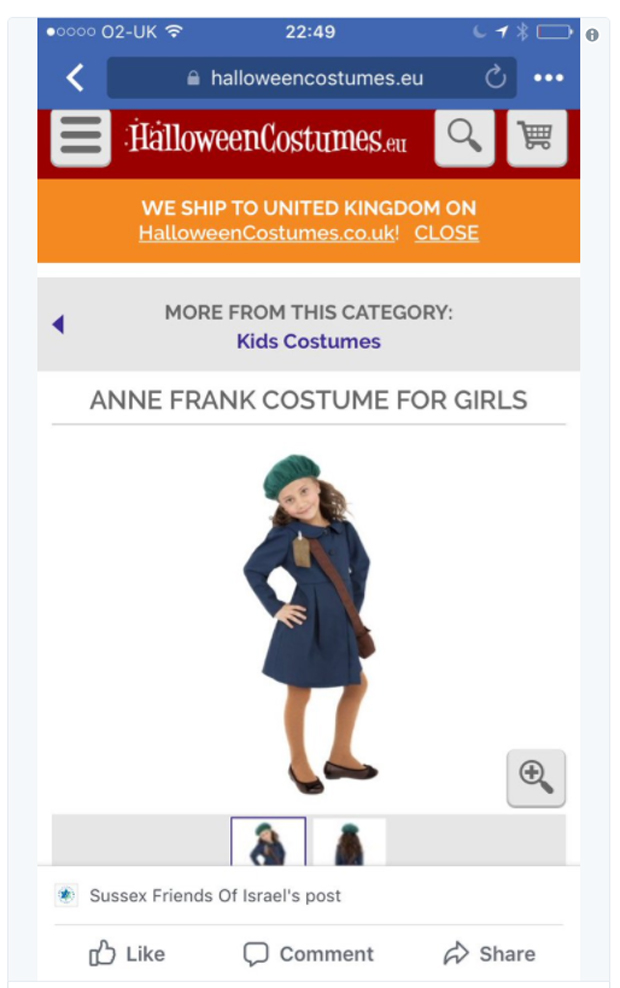 Αιτία αποτέλεσε ένα κοστούμι «Άννα Φρανκ», το οποίο παρουσιάστηκε και με την περιγραφή «Κορίτσι πρόσφυγας του Β' Παγκοσμίου Πολέμου». Όπως μετέδωσε το βρετανικό τηλεοπτικό δίκτυο BBC, πολλές επιχειρήσεις που προμηθεύτηκαν το εν λόγω προϊόν (HalloweenCostumes.com) και το διέθεταν προς πώληση εν όψει Halloween, αναγκάστηκαν να το αποσύρουν, έχοντας αντιμετωπίσει την οργή χιλιάδων χρηστών στα social media. Στην επίμαχη φωτογραφία προώθησης της στολής εμφανίζεται ένα χαμογελαστό κορίτσι με πράσινο μπερέ, μπλε φορεματάκι και καφέ σακίδιο.