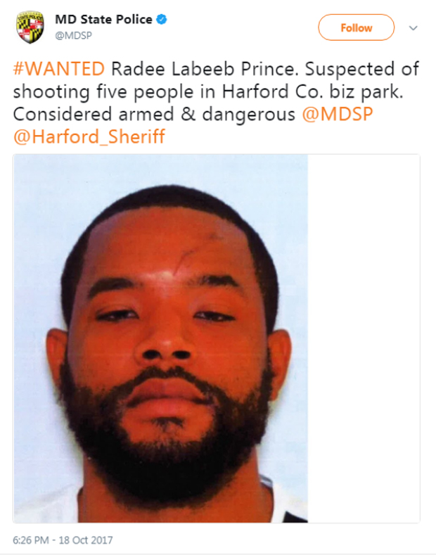 Εκπρόσωπος των τοπικών αρχών ανέφερε ότι ο ένοπλος δεν έχει συλληφθεί μέχρι στιγμής. Σύμφωνα με δημοσίευμα του baltimoresun.com, η αστυνομία αναζητεί έναν 37χρονο ύποπτο, ονόματι Ρέιντι Λέιμπι Πρινς (Radee Labeeb Prince).