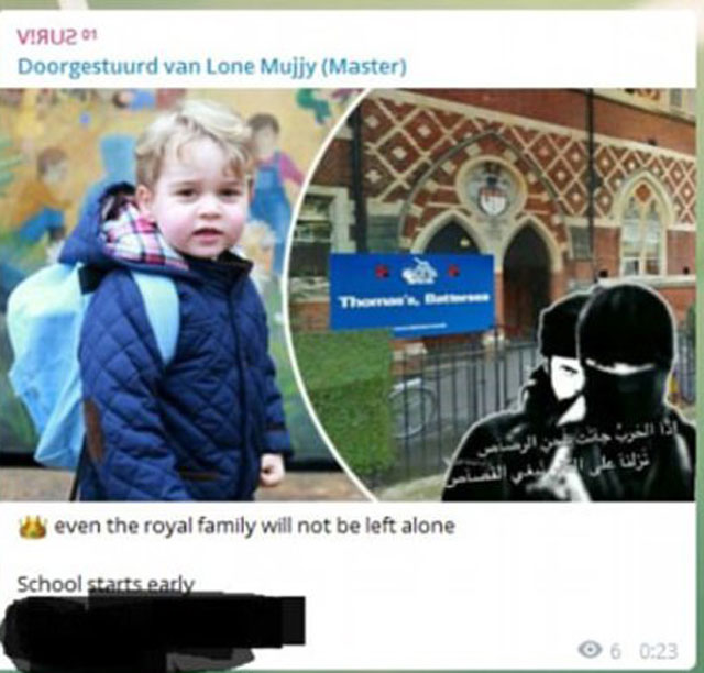 Τον πρίγκιπα Τζορτζ φαίνεται να απειλούν οι τζιχαντιστές, ενώ η απειλή έχει δημοσιευτεί στο application των τζιχαντιστών, το Telegram: Χρησιμοποιήθηκε μια παλαιότερη φωτογραφία του μικρού πρίγκιπα από την πρώτη ημέρα στον παιδικό σταθμό με το μήνυμα «ούτε η βασιλική οικογένεια θα μείνει ήσυχη». «Το σχολείο ξεκινά νωρίς», γράφει ακόμη, ενώ αναγράφουν και τη διεύθυνση του σχολείου όπου φοιτά ο τρίτος διάδοχος του βρετανικού θρόνου.