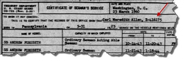 Στην πραγματικότητα όμως, αν και ο Allen ήταν όντως μέλος του πληρώματος, το SS Andrew Furuseth βρισκόταν σε αποστολή κομβόι (UGS 22) από τις 25 Οκτωβρίου έως τις 22 Νοεμβρίου 1943, με προορισμό τo Πορτ Σάιντ.