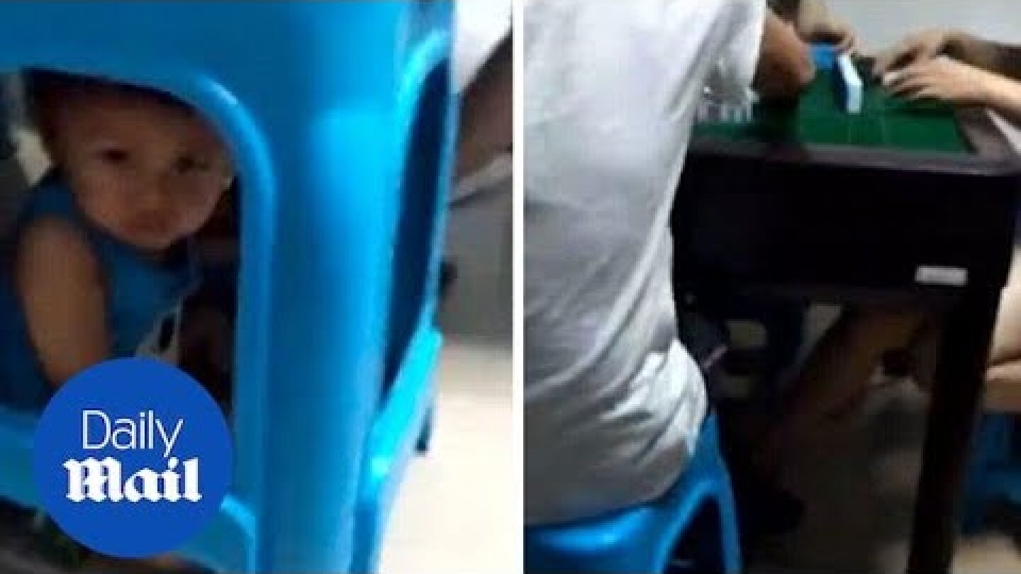 Τον γύρο του διαδικτύου κάνουν οι εικόνες που δείχνουν μια μητέρα στην Κίνα να έχει εγκλωβίσει το παιδί της κάτω από ένα πλαστικό σκαμπό για να παίξει Μαγιόνγκ (σ.σ. είδος παιχνιδιού με χαρτιά).